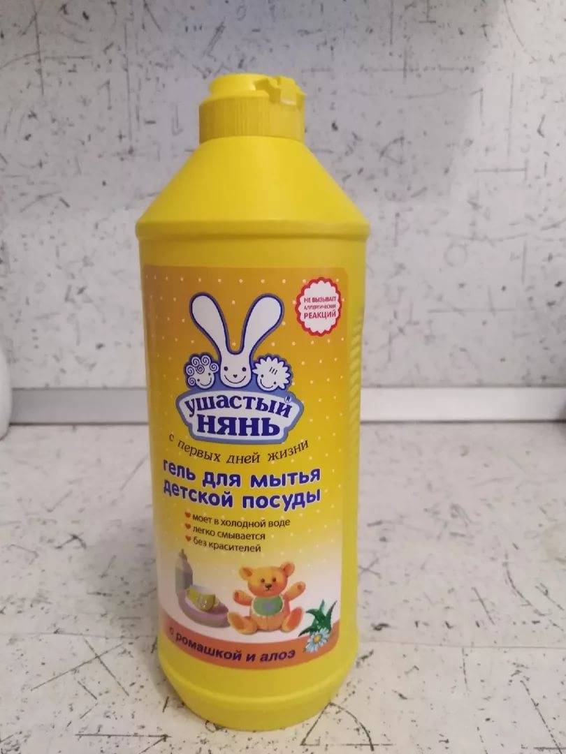 - Гелем «Ушастый нянь» можно мыть посуду из любых материалов. Он гипоаллергенен, не содержит красителей, оптимален по стоимости, а потому наиболее востребован в линейке детских средств. В геле используется натуральный ароматизатор (ромашка или алоэ вера). Недостаток — наличие консервантов, правда, в небольшом количестве.