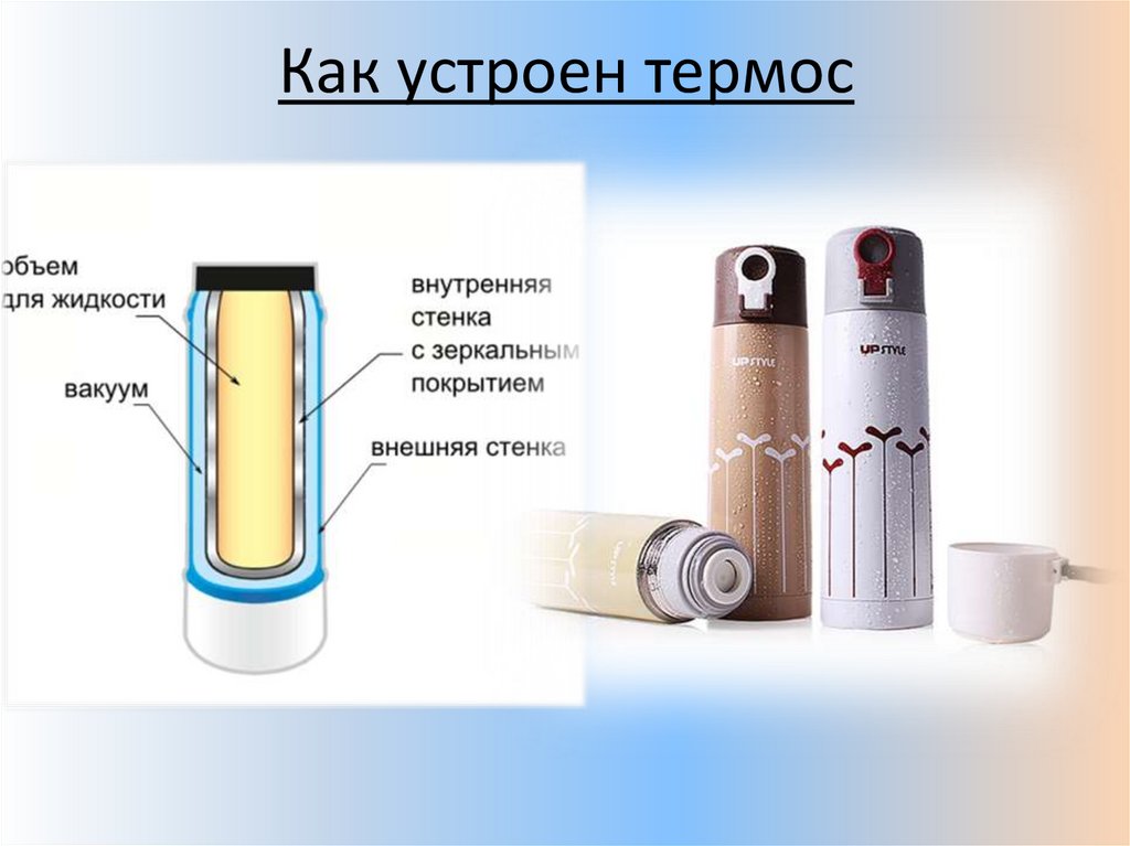 Термос должен удерживать температуру жидкости длительное время. Он состоит из цилиндрического корпуса, внутренней колбы. Эффект теплосбережения достигается благодаря двойным стенкам и вакууму.