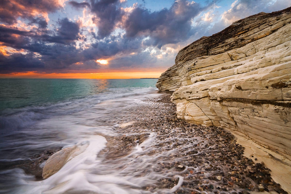 Скалы под действием ветра, волн и дождей приобрели причудливую форму. Море тут чистого лазурного цвета, так как дно покрыто базальтовыми породами. Белые скалы не нагреваются от солнечных лучей, камни остаются прохладными. Сюда стоит приехать, чтобы позагорать и поплавать в чистейшей воде.