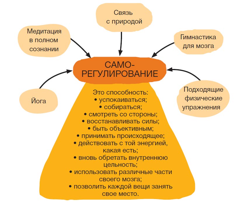 Саморегулирование — это все, что дает нам возможность собраться в нечто цельное, единое, стать уравновешенными и спокойными, полностью владеть своими ресурсами. С какой бы точки мы ни начали, все, что помогает двигаться в этом направлении, принесет пользу нашему ребенку не только в его отношениях с нами, но и в отношениях с другими — как сейчас, так и на протяжении всей его жизни.
