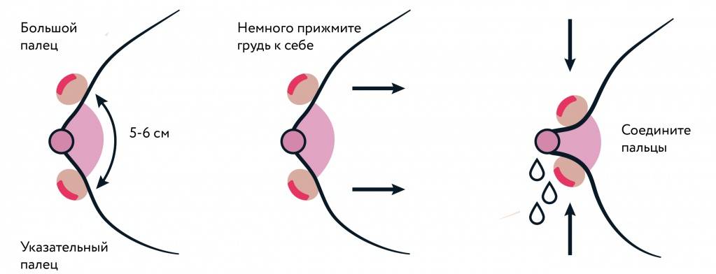 Если у вас довольно большая грудь, ее лучше приподнять и поддерживать ладонью. Поставьте подушечки большого и указательного пальца на ареолу, примерно на расстоянии 3 сантиметров от соска. Немного прижмите этими пальцами грудь к себе, затем соедините пальца вместе, тем самым немного сжав сосок. Больно быть не должно. Если вы чувствуете боль, значит, вы поставили пальцы слишком далеко от соска, и захватываете железистую ткань. Сдвиньте их чуть ближе к соску.