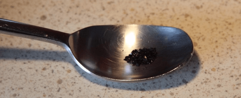 - Количество марганцовки должно быть минимальным! Нужно взять всего 5-6 кристаллов, чтобы они небольшой кучкой лежали на самом дне маленькой ложечки.