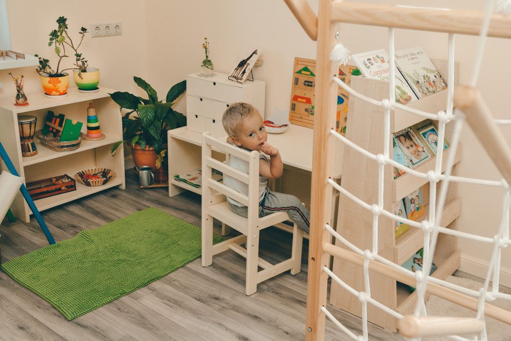 В комнате стоят кровати, уголок для чтения, полки и вешалка для одежды, спортивный комплекс, полки под материалы и игрушки, несколько упражнений для практической жизни.