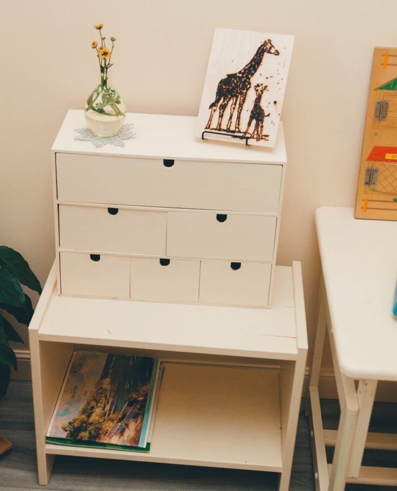 Дочь любит рисовать, лепить и вообще что-то делать руками. Для хранения материалов для творчества поставили Даше комод — в него она складывает пуговицы, нитки и бисер для вышивки, пластилин, кисти, краски и карандаши, бумагу для рисования и ткань для шитья