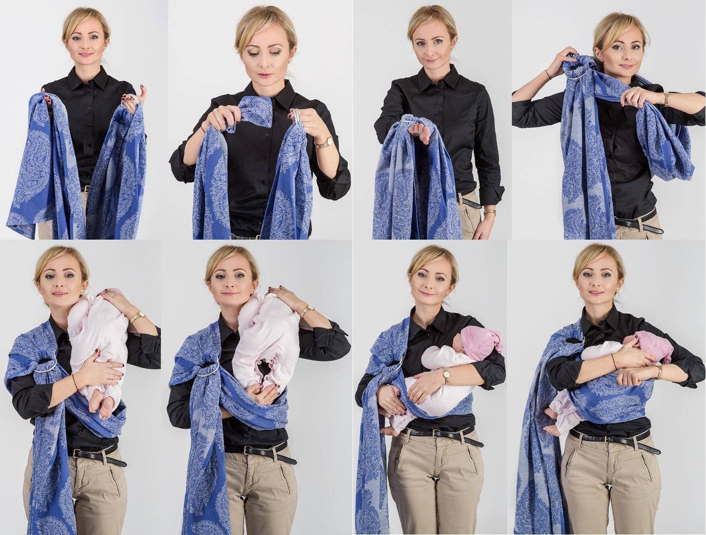 - Слинг с кольцами: слинг с кольцами, как носить новорожденного: спереди и на боку;