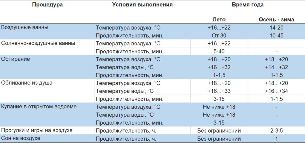 Для детей от 1 до 3 лет температура воздушных ванн составляет 18–19 °С, в возрасте от 3 до 6 лет она снижается до 16 °С. Во время процедур дети должны находиться в движении, участвуя в подвижных играх.
