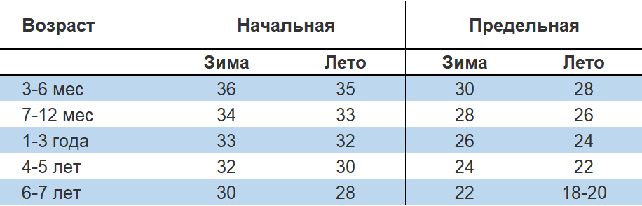 В дальнейшем переходите к обливанию, ванне, душу и купанию. При кратковременных общих процедурах для детей в возрасте до 1 года начальная температура воды составляет 35–36 °С. Постепенно (в течение трех недель) температура снижается до 28 °С. Для более старших детей (1-6 лет) начальная температура воды должна быть 33-34 °С, а затем постепенно снижаться (в течение месяца) зимой – до 26 °С, а летом – до 24 °С.